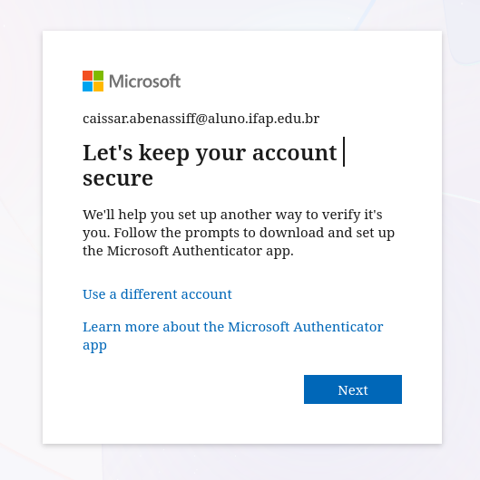 Após isso, você verá uma mensagem pedindo para manter sua conta de e-mail acadêmico segura, clique em Avançar. Você verá uma mensagem pedindo para que siga as instruções para manter sua conta segura:
