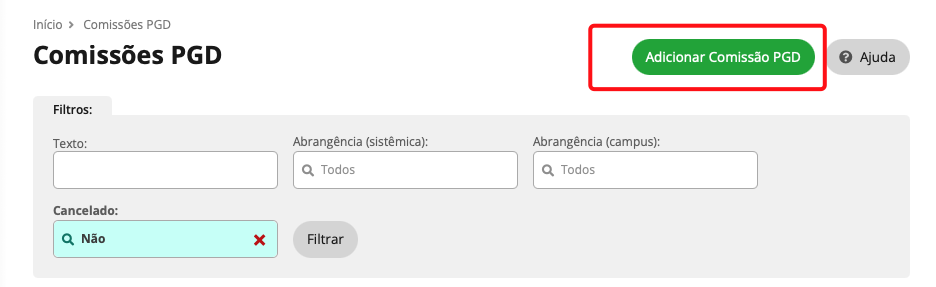 Selecione o botão “Adicionar Comissão PGD”, localizado no canto superior direito da tela.