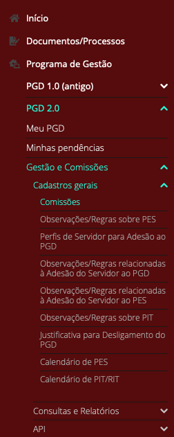 Programa de Gestão → PGD 2.0 → Gestão e Comissões → Cadastros Gerais → Comissões