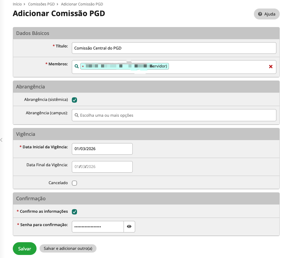 Após o preenchimento completo de todos os campos obrigatórios, deve-se clicar em “Salvar” para concluir o cadastro. Uma vez registrada, a comissão passará a constar na listagem de comissões do PGD e seus membros poderão exercer as atribuições administrativas previstas no módulo do PGD 2.0.