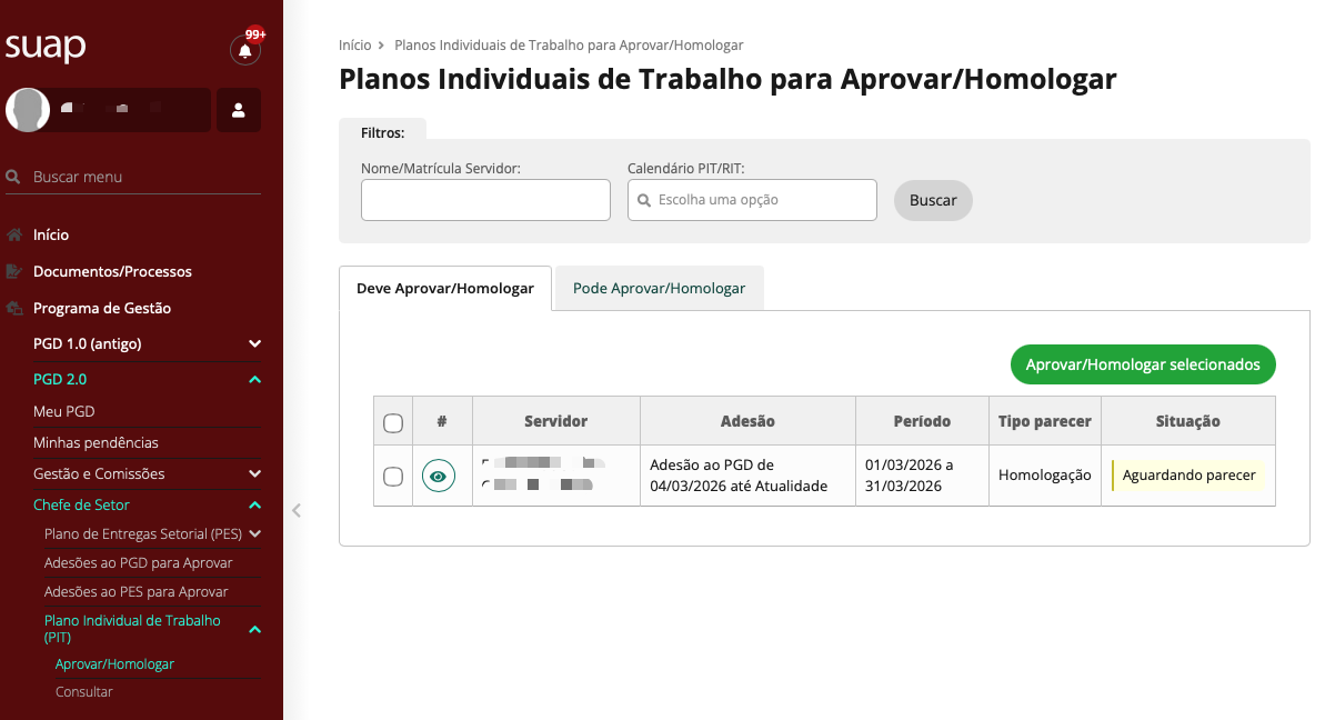 SUAP → Programa de Gestão → PGD 2.0 → Chefe de Setor → Plano Individual de Trabalho (PIT) → Aprovar/Homologar