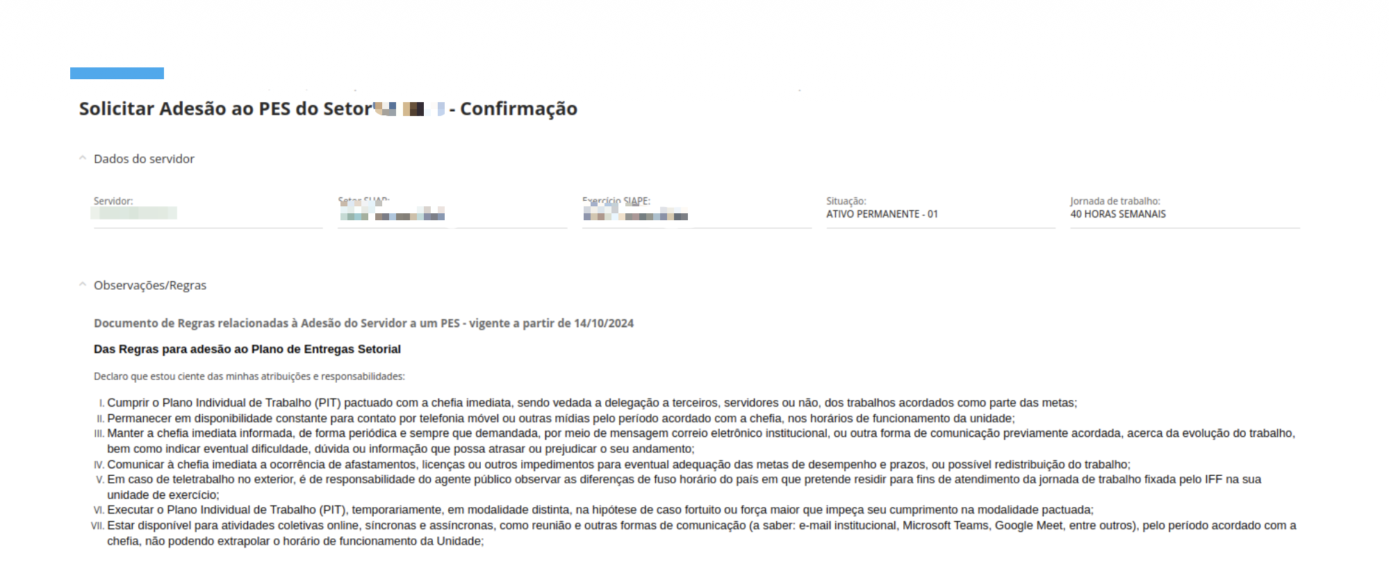 Nesse ambiente, a Comissão poderá cadastrar as orientações e regras que serão exibidas ao servidor no momento em que ele solicitar adesão a um Plano de Entregas Setorial (PES). Ao realizar a solicitação, o servidor deverá ler integralmente as orientações apresentadas, preencher as informações solicitadas — especialmente os dados de contato —, concordar com os termos estabelecidos e efetuar a assinatura eletrônica no sistema.
