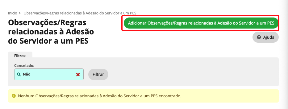 Ao acessar a tela Observações/Regras relacionadas à Adesão do Servidor a um PES, será apresentada a listagem das regras já cadastradas, bem como os filtros disponíveis para consulta.