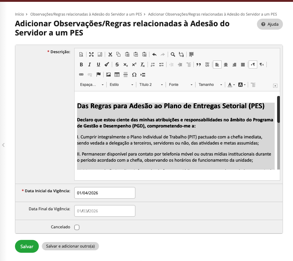 É importante observar que a Data Inicial de Vigência definida nesse cadastro determinará a partir de quando os servidores estarão habilitados a solicitar adesão aos PES dos respectivos setores. Por esse motivo, recomenda-se que a data seja configurada em consonância com o cronograma oficial de implantação do PGD, garantindo que as solicitações ocorram apenas no período previamente autorizado pela Comissão.