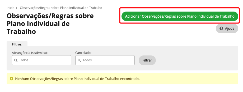 Ao selecionar essa opção, será exibida a tela de listagem das regras já cadastradas. Para incluir uma nova orientação, deve-se clicar no botão verde “Adicionar Observações/Regras sobre Plano Individual de Trabalho”, localizado no canto superior direito da tela. O sistema abrirá o formulário para inserção do texto orientativo que será apresentado ao servidor no momento em que ele adicionar um PIT no sistema.