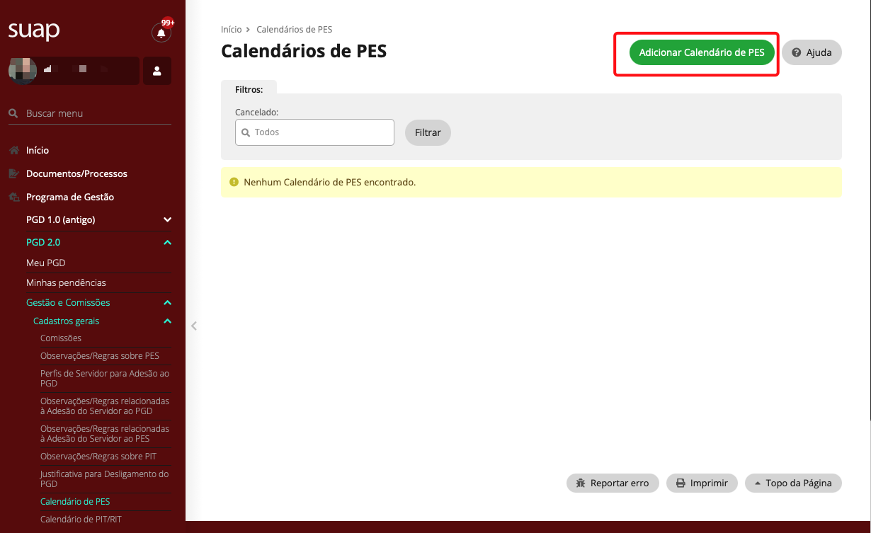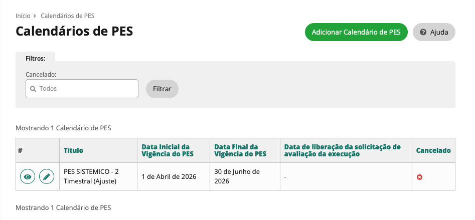 Ao acessar a tela “Calendários de PES”, será exibida a listagem dos calendários já cadastrados. Para criar um novo período, deve-se selecionar o botão verde “Adicionar Calendário de PES”, localizado no canto superior direito da tela. Ao clicar, o sistema abrirá o formulário para cadastro do calendário.