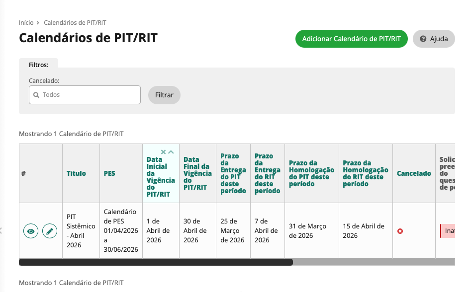 Ao acessar a tela “Calendários de PIT/RIT”, será exibida a listagem dos calendários já cadastrados. Para incluir um novo período, deve-se selecionar o botão verde “Adicionar Calendário de PIT/RIT”, localizado no canto superior direito da tela. Ao clicar, o sistema abrirá o formulário para cadastro do calendário.