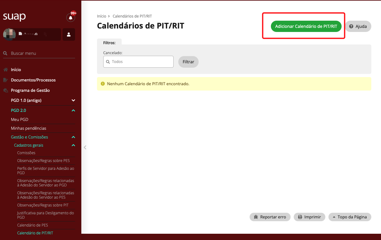 Para cadastrar o calendário do Plano Individual de Trabalho (PIT) e do Relatório Individual de Trabalho (RIT), o usuário deverá acessar o menu Programa de Gestão → PGD 2.0 → Gestão e Comissões → Calendário de PIT/RIT.