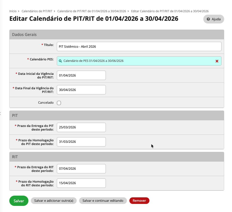 No campo Título, deve-se informar uma identificação clara do período, como por exemplo: “Calendário PIT/RIT – Março/2026” ou “Calendário PIT/RIT – 1º Ciclo 2026”.