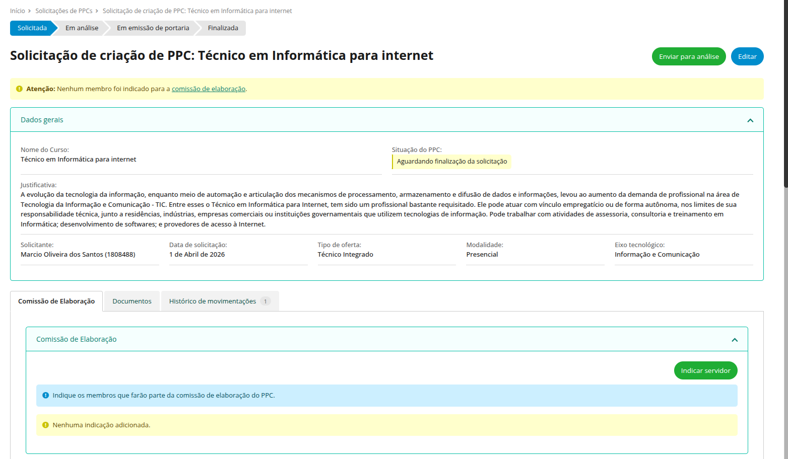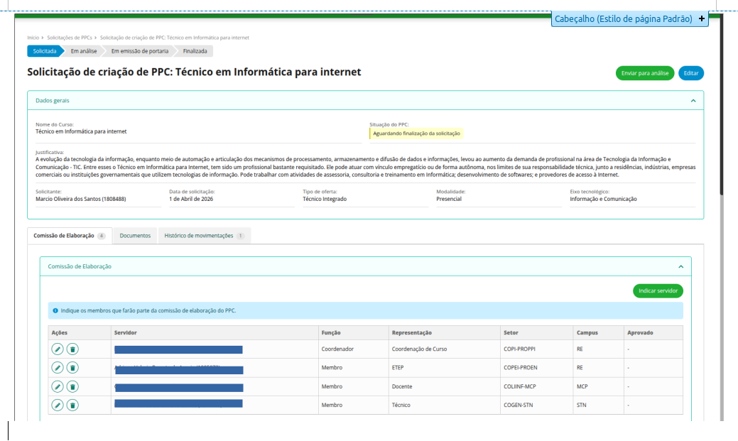 Trâmites da solicitação do PPC