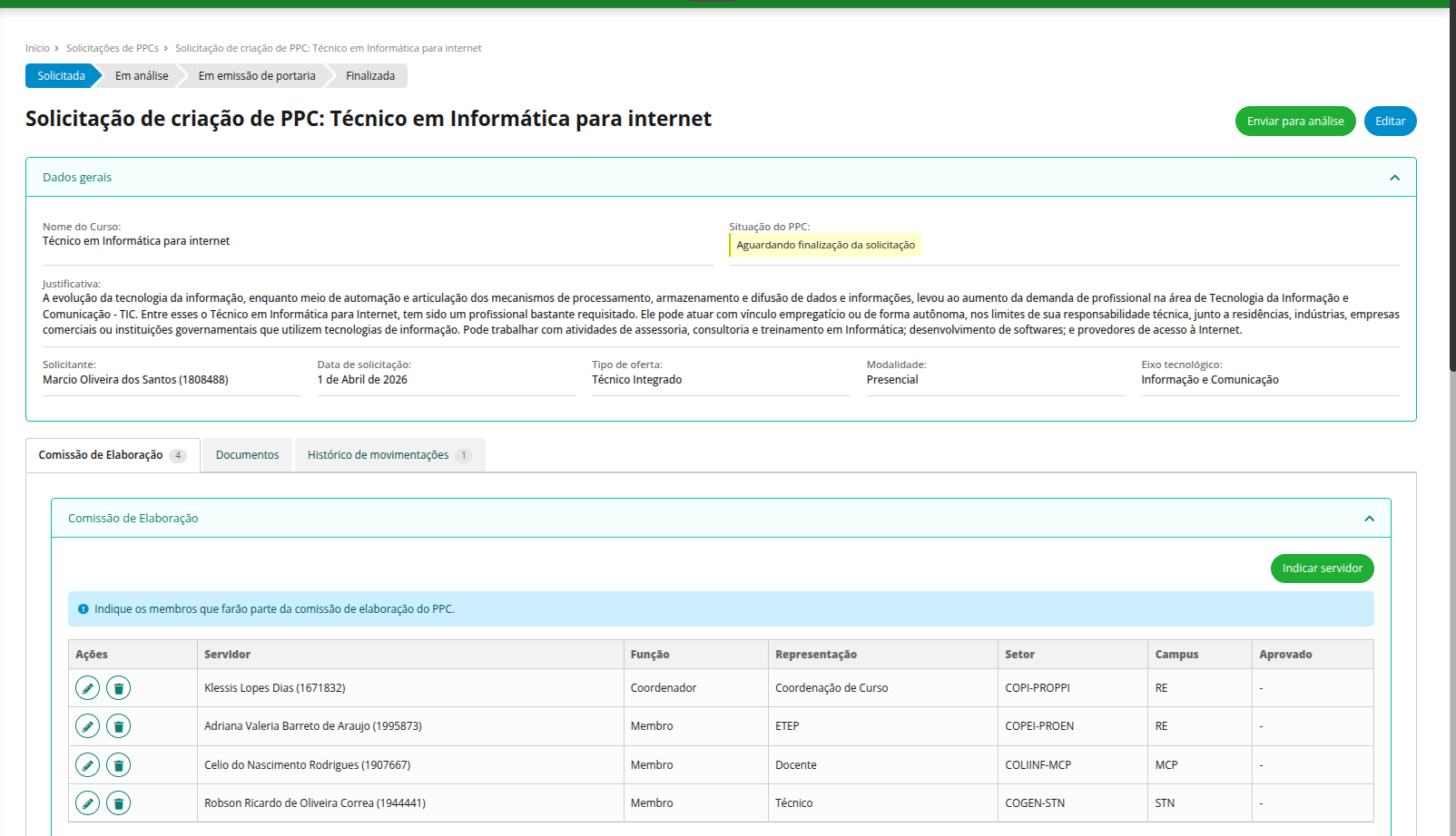 Trâmites da solcitação do PPC